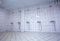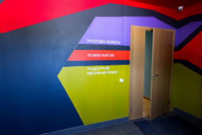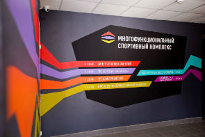 Зал расположен на 3-м этаже и имеет линейные размеры 18х24 метра, высоту потолка 5 м и напольное спортивное покрытие Tarkett OMNISPORTS.